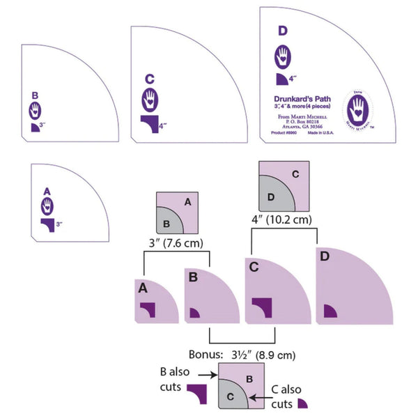 Set T - 5" (12.7cm) Square Basic Set. From Marti Michell. 3 pieces to cut 7 shapes. 5" square plus 6 common component parts. Makes 5" units for 10" to 40" blocks. 15 block designs included.